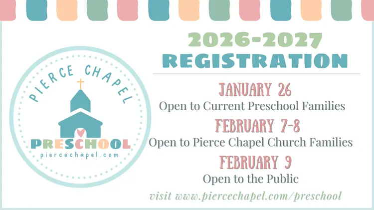 For those thinking about next year’s school plans, registration for our Pierce Chapel Preschool is now open! We would love to partner with your family to help your preschoolers, age1-4, learn and grow!You can visit the link below to view classes and registration information.Registration Form